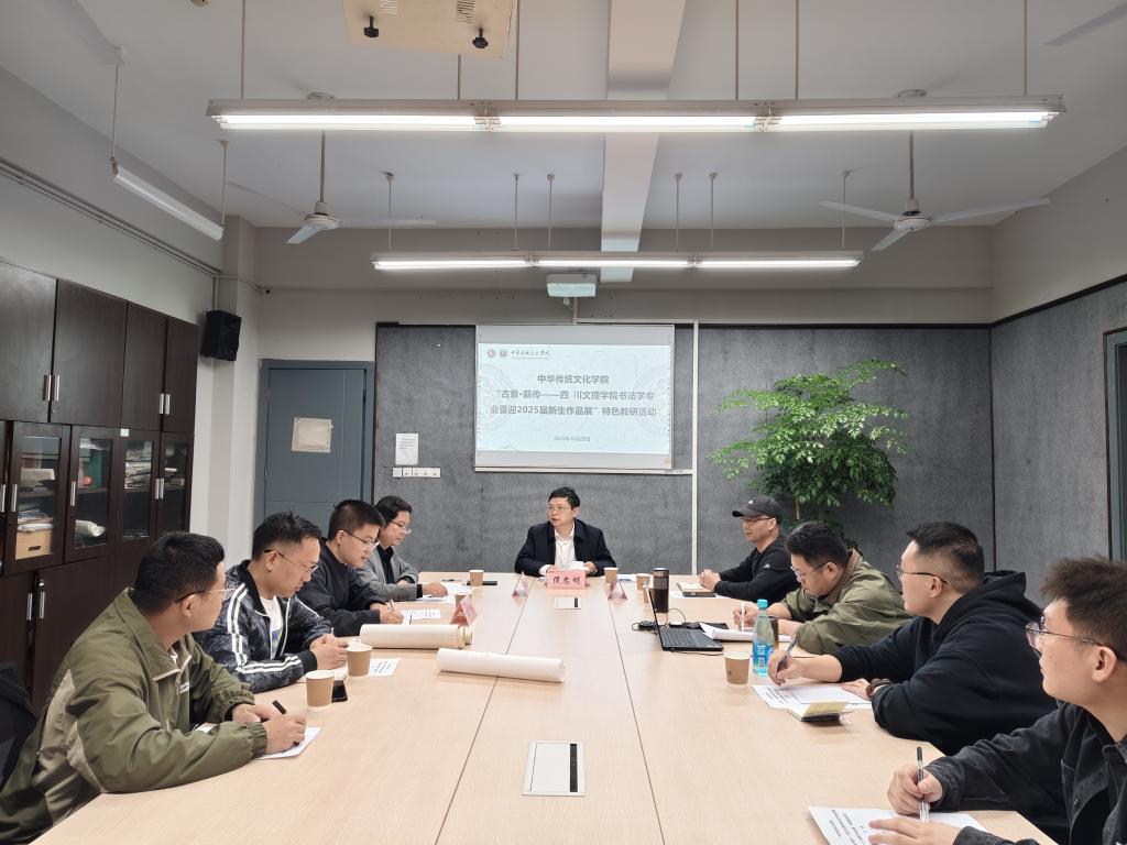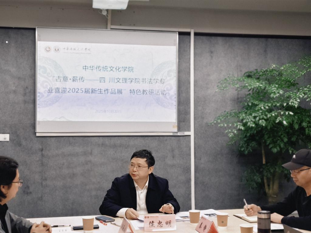 10月20日晚,校长侯忠明莅临我院,专题指导“古意·薪传——四川文理学院书法专业喜迎2025届新生作品展”特色教研活动。院长刘承川主持并介绍展览准备情况,党委副书记(主持工作)秦静、书法学专业全体专任教师参加。