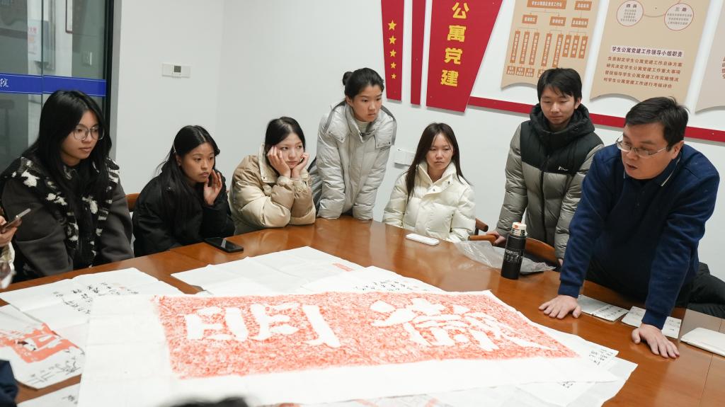 在互动环节,朱中原现场展示了个人珍藏的拓印作品,引导同学们细致观察,逐一讲解碑刻中刀法与笔意交融的艺术特征。他强调,临摹是学习的基础步骤,但更深层次的目标在于从传统笔墨中汲取智慧,形成独立的艺术思考。同学们或近距离观摩拓片细节,或执笔体验线条勾勒,在实践中感受书法艺术的魅力,完成了一次与千年文化遗产的深度对话。