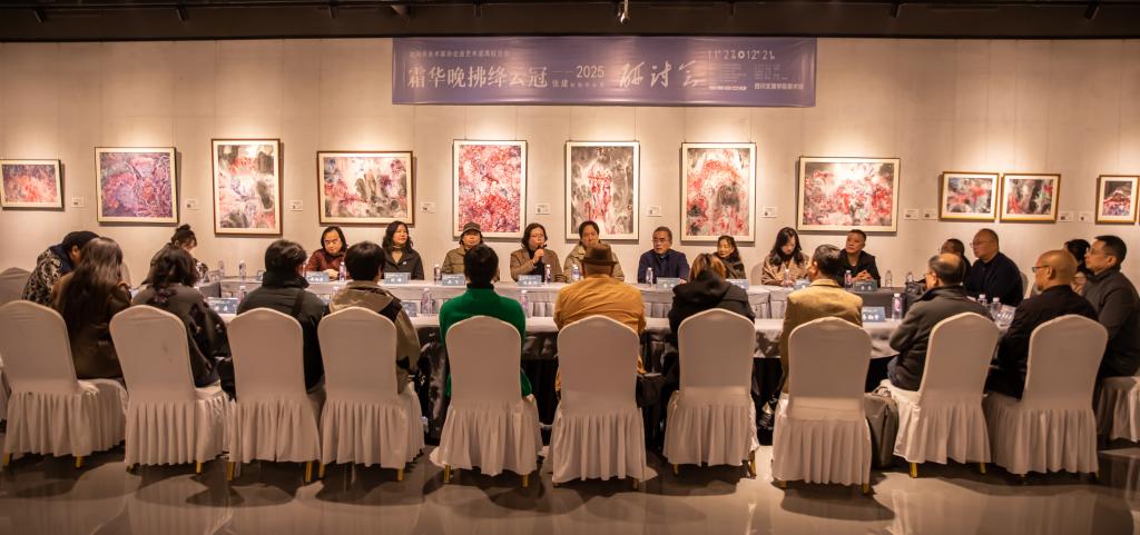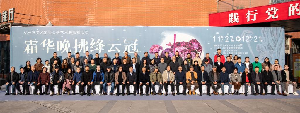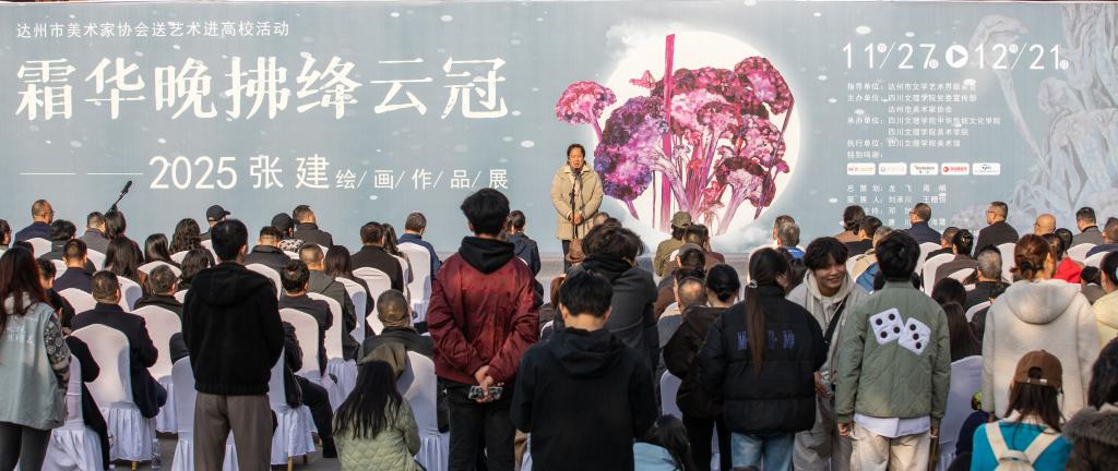2025年11月27日下午15:00,由达州市文学艺术界联合会指导,达州市美术家协会、四川文理学院党委宣传部联合主办,四川文理学院中华传统文化学院、美术学院承办的达州市美术家协会“送艺术进高校”系列活动“霜华晚拂绛云冠——张建绘画作品展”在四川文理学院盛大启幕。