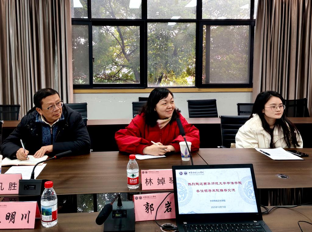 12月15日,西华师范大学书法学院党委书记孔凡胜、副院长林婥琴一行来我院调研交流,副院长熊明川主持座谈会。
