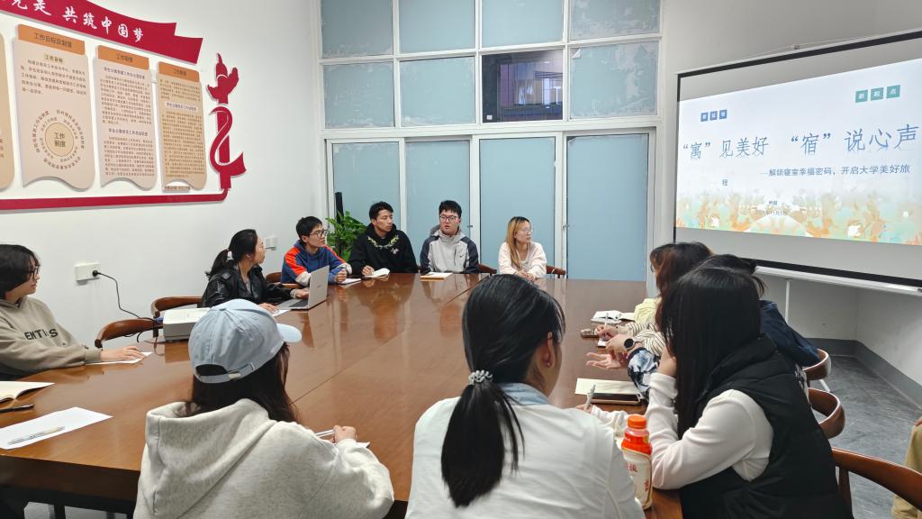 11月5日,学生党支部书记尹超走进“一站式”学生社区,组织开展以“‘寓’见美好,‘宿’说心声”为主题的寝室文化建设交流活动,全体2025级寝室长参加活动。