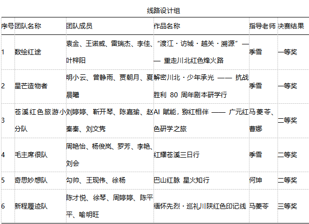 近日,2025“苍溪杯”全国大学生红色文旅数字运营与创意设计大赛结果出炉,我院学生凭借扎实的专业功底与创新的创意表达,在多个赛道脱颖而出,共有11支团队获奖,其中一等奖2项、二等奖3项、三等6项,覆盖全部三个赛道: